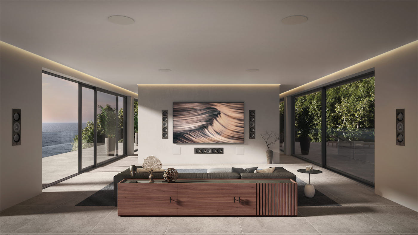 - Reference Cinema (Projector & Screen): Dedicated rooms built for ultimate fidelity, featuring 8K/4K laser projectors, custom acoustically transparent screens, and reference-grade THX/Dolby Atmos audio systems with architectural speakers that disappear behind the screen fabric.